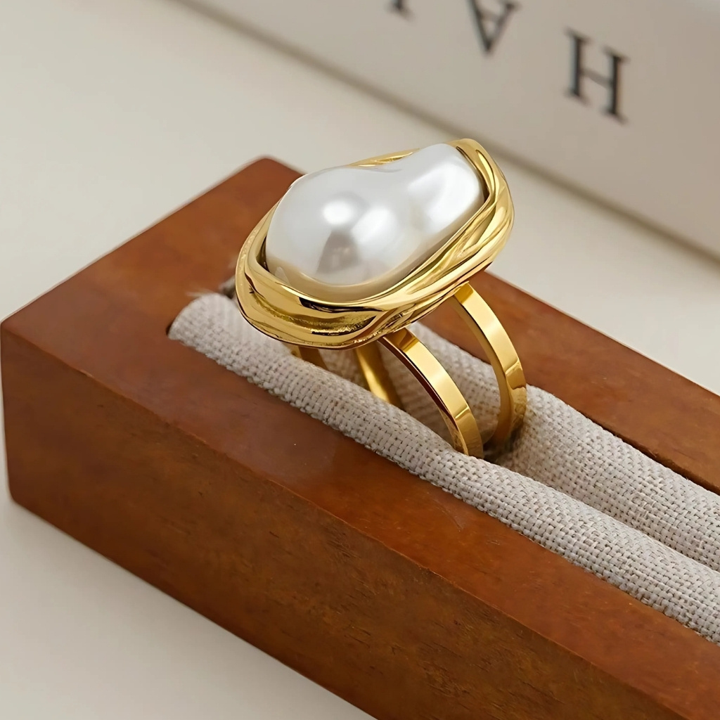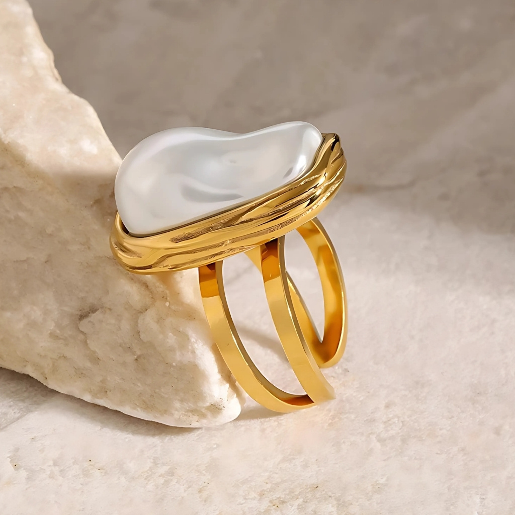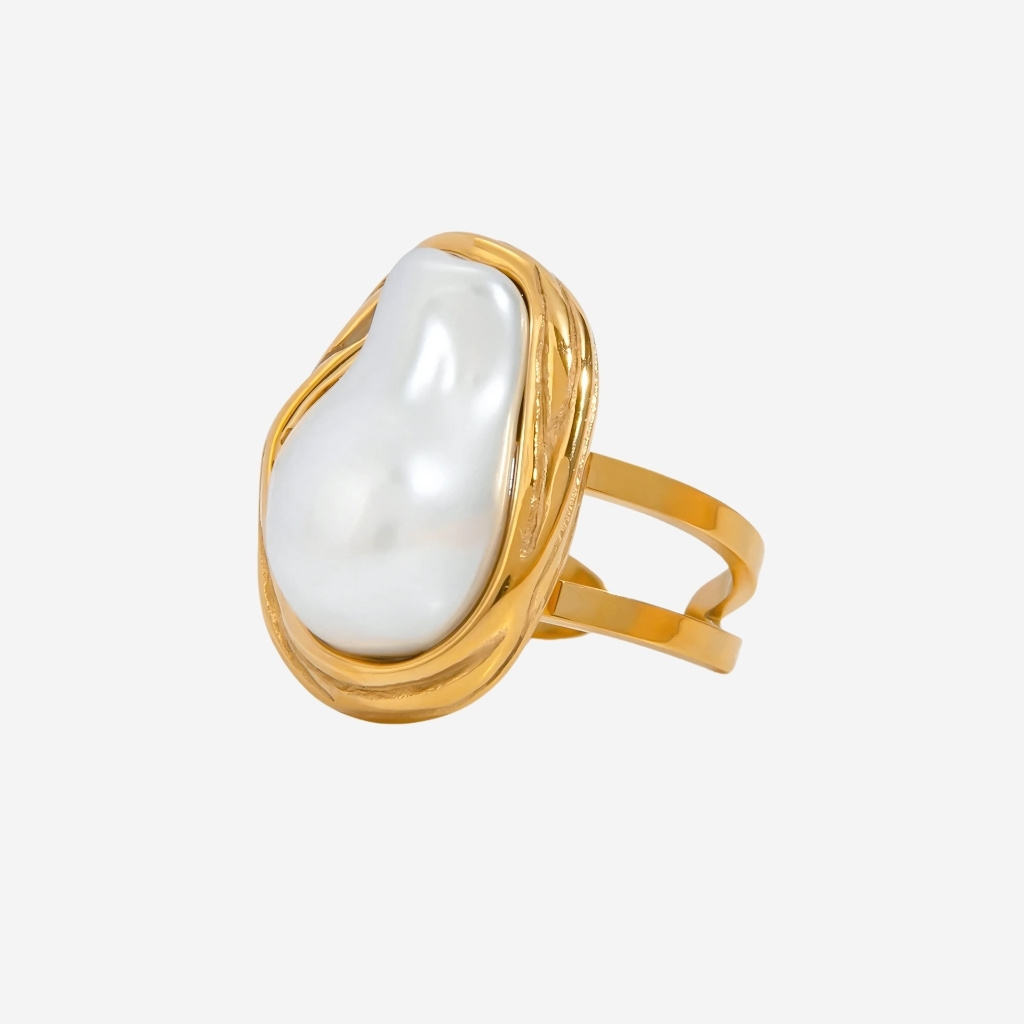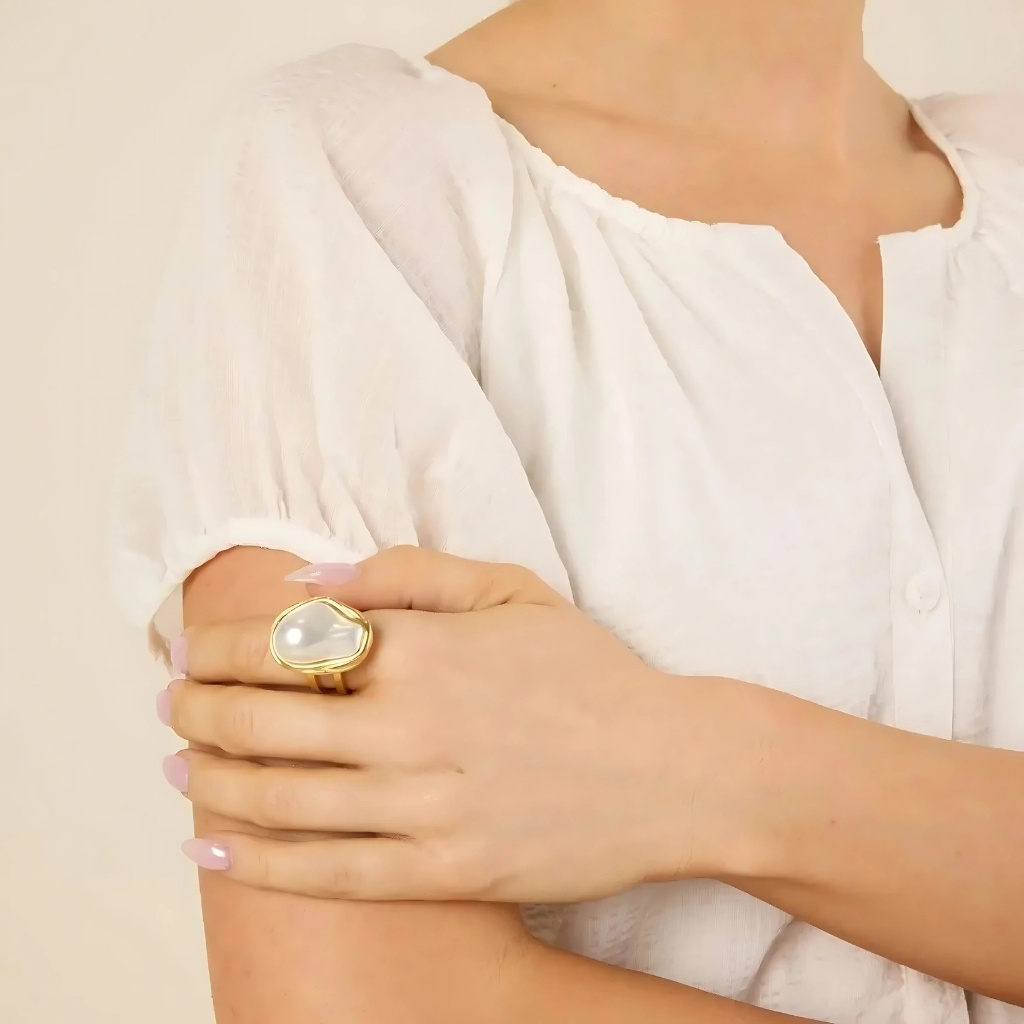 O Anel Gota Dourada & Pérola é a união perfeita entre design orgânico e elegância atemporal. Com curvas fluidas que evocam a delicadeza de uma gota dourada envolvendo uma pérola sintética, esta joia celebra a harmonia das formas naturais com um brilho suave e refinado.