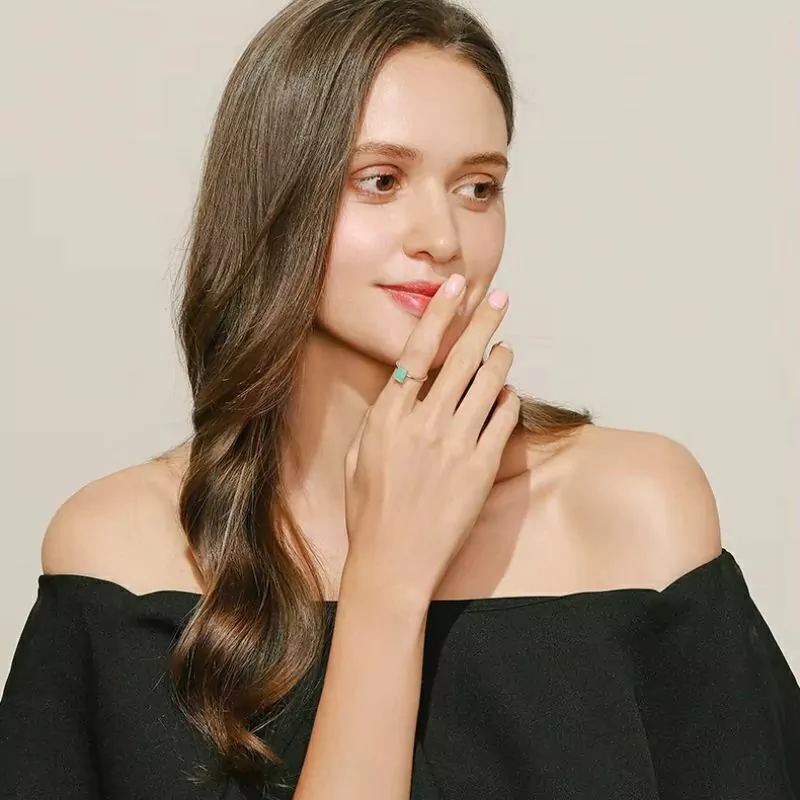 Produzido em prata de lei 925 com acabamento polido impecável e aproximadamente 1,5g, o anel apresenta uma turmalina retangular de 6×8mm lapidada em corte esmeralda, engastada em quatro garras que realçam sua luminosidade cristalina. Design minimalista e atemporal que permite à pedra ser a protagonista absoluta.