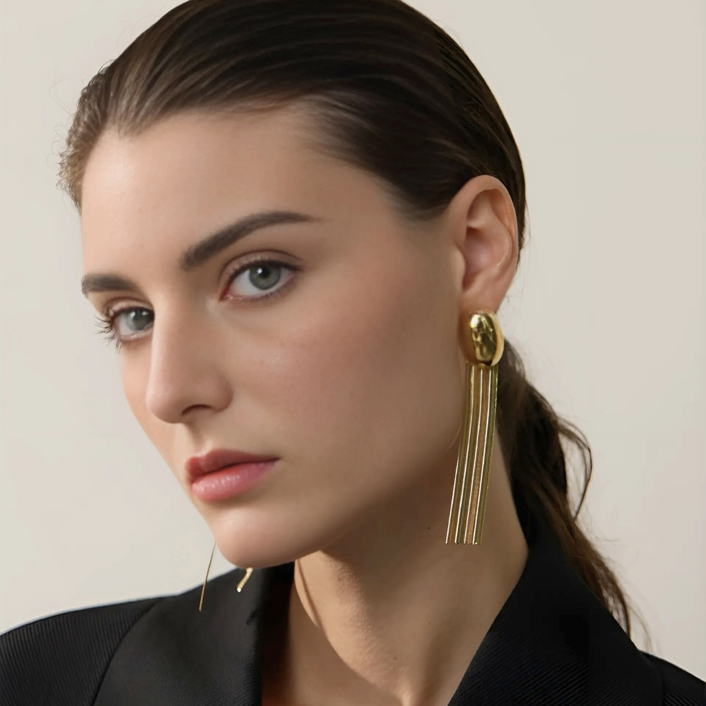 O Brinco Cascata Dourada traduz elegância em movimento. Com 95 mm de comprimento, sua forma alongada desliza suavemente, iluminando o rosto com leveza e sofisticação. O banho de ouro 18K via tecnologia PVD e o acabamento espelhado garantem brilho intenso e duradouro, enquanto a estrutura leve proporciona conforto mesmo em uso prolongado. O fecho de pino oferece fixação segura e praticidade, tornando-o perfeito para ocasiões especiais ou para transformar um look cotidiano em algo memorável.