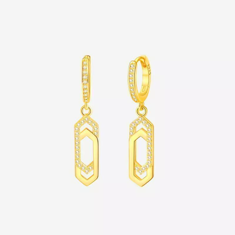 Produzido em prata de lei 925 com revestimento em ouro 18K de alta densidade e acabamento polido impecável, oferece brilho duradouro e presença refinada. Formato de argola alongada que emoldura o rosto com sofisticação arquitetônica.