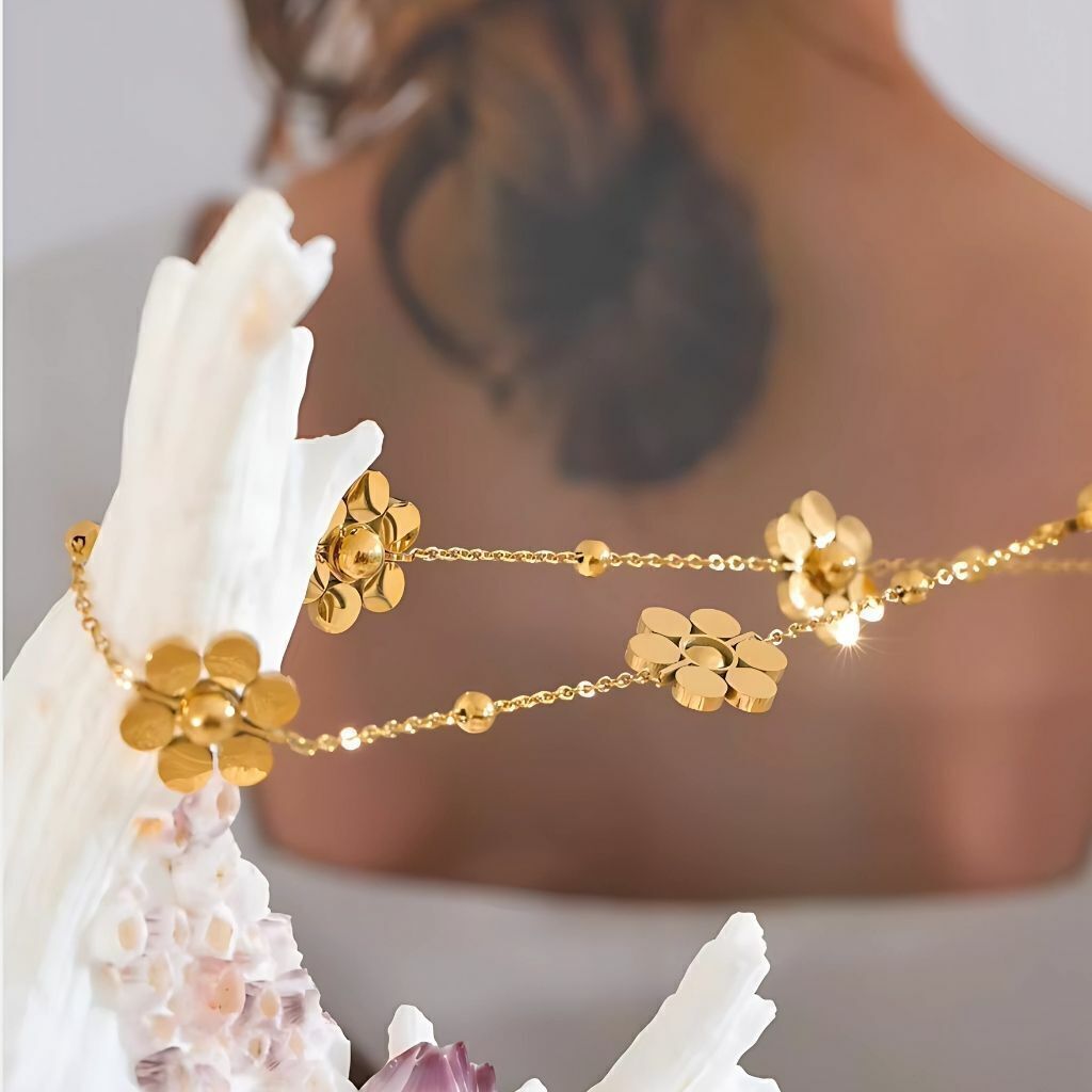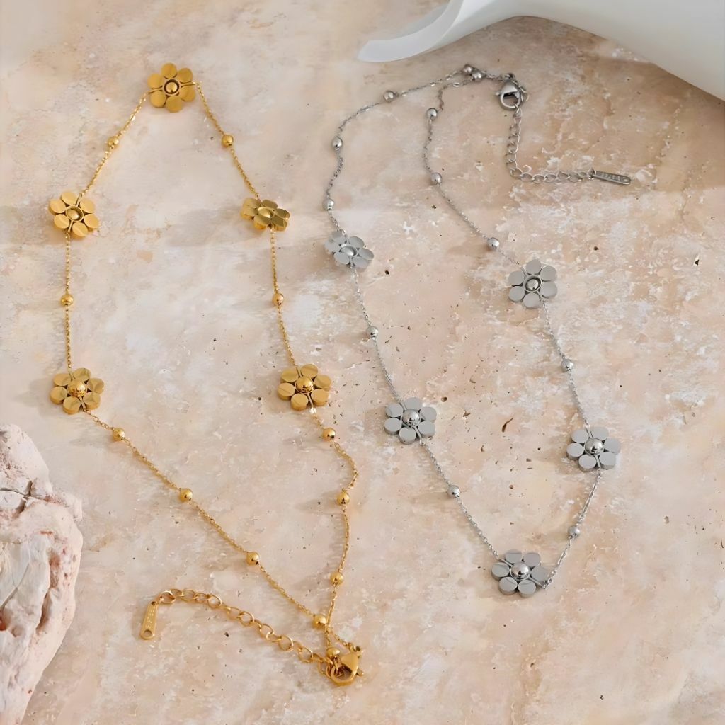 Delicado e encantador, o Colar Aura Floral celebra a beleza da natureza com um design inspirado nas formas suaves das flores. Seu pingente floral banhado a ouro 18K transmite leveza, feminilidade e um brilho sutil que ilumina o colo com elegância. Uma peça romântica e atemporal, perfeita para compor visuais delicados com um toque poético.