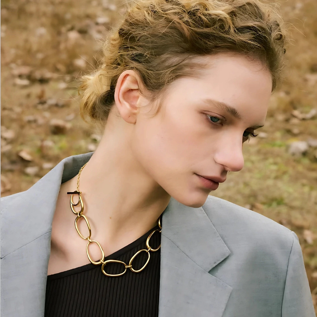 Design Impactante – Elos ovais largos com acabamento espelhado que adicionam brilho e imponência