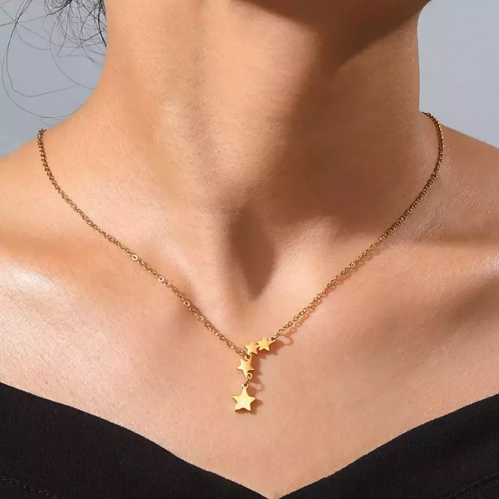 Este colar encanta com seu design sofisticado, trazendo pingentes delicados que evocam o brilho das estrelas, cuidadosamente distribuídos ao longo de uma corrente banhada a ouro 18K. Esta peça combina o brilho das estrelas com um design minimalista, tornando-a ideal para compor looks do dia a dia ou especiais. O toque dourado confere um ar de luxo discreto, enquanto o motivo estrelado adiciona um encanto único e moderno.