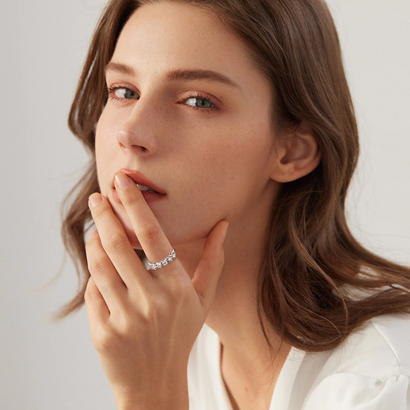 A Meia Aliança Eternidade de Moissanite em Prata de lei é uma combinação perfeita de moda e significado. Seu design exibe uma fileira de moissanites duradouras, simbolizando momentos inesquecíveis e a beleza da eternidade. Fabricada em prata de lei 925 de alta qualidade, essa peça reflete sofisticação e durabilidade, sendo ideal para graças especiais ou para adicionar um toque luxuoso ao seu dia a dia.