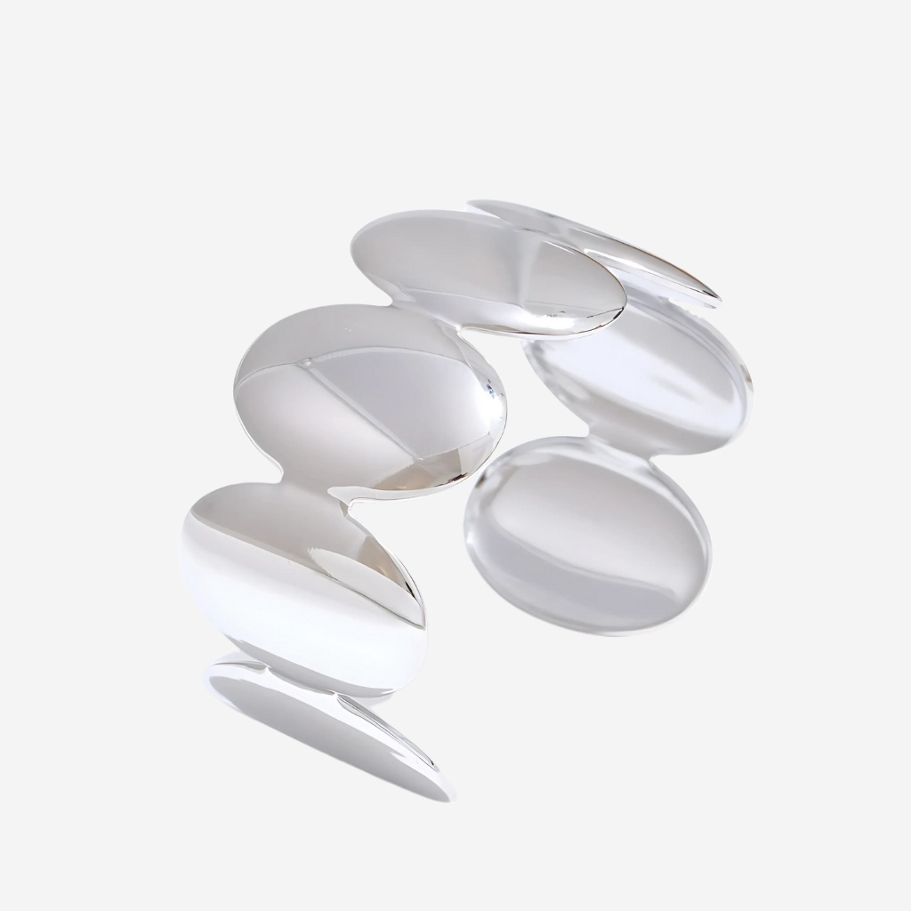 Inspirada nas formas orgânicas da arte escultural, esta pulseira é uma verdadeira peça de destaque. Seu design curvo e fluido envolve o pulso com sofisticação, enquanto o banho em ouro 18K adiciona um brilho luxuoso e atemporal.