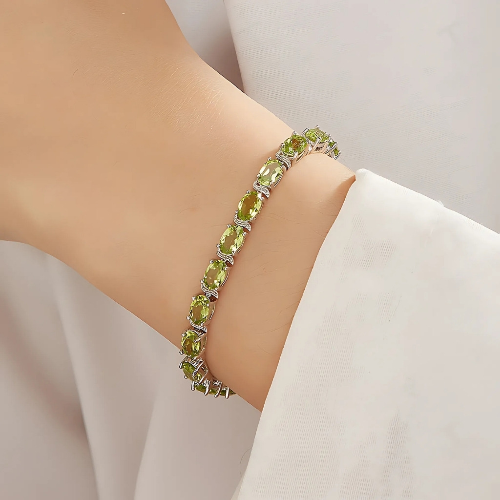 A Pulseira Peridotos Radiante é uma celebração à exuberância e à força renovadora da natureza, capturada em uma joia que transcende o tempo. Com 24 peridotos naturais lapidados em formato oval (4×6mm), totalizando aproximadamente 12ct de pura luz e energia, esta peça exala uma tonalidade verde vibrante que evoca frescor, equilíbrio e sofisticação.